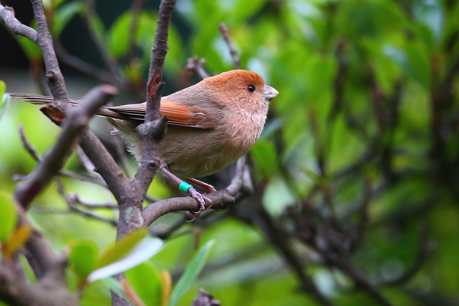 山紅頭, 學名: Stachyridopsis ruficeps (Cyanoderma ruficeps), 共有7個亞種分布在長江以南, 越南以北, 台灣以西及喜瑪拉雅山脈以東這個區域, 台灣亞種為特有亞種 praecognitum (Swinhoe, 1866), 適應力強, 可從低海拔平原到2,500公尺的高山, 叫聲為連續4聲「都.都.都.都.」, 呼叫同伴則為「救.急.」, 在植物園內會與粉紅鸚嘴混群, 在野外會與綠畫眉、繡眼畫眉混群。