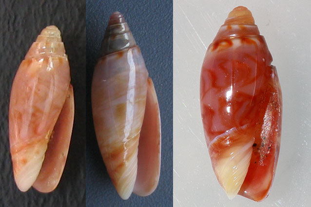 一種殼胚紅色,體層較細長(下圖中),另一種殼胚淡黃色,體層較短(下圖左及下圖右),雖然榧螺專家olividae認為是相同