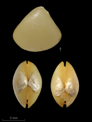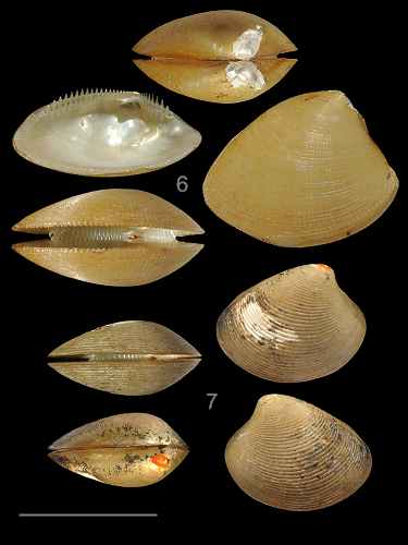 編號5殼長4-6mm,尺寸小,同屬棲息最淺者(潮間帶至50m)