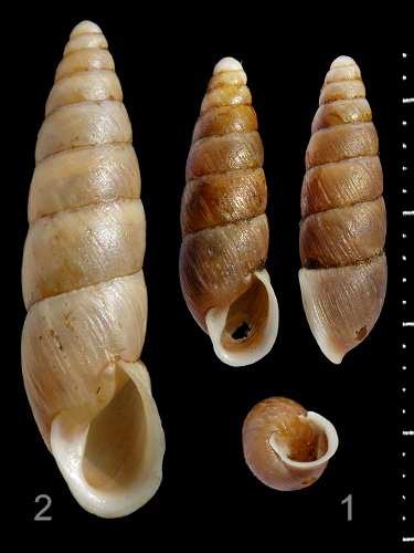 此地竟然也出現擬煙管蝸牛,體型小,與棲息低山溪谷的殼比較如下: