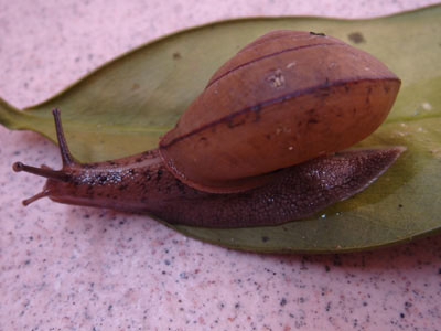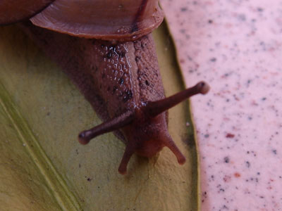 十多天之後,seashell2392打電話來跟我說,夾鏈袋裡的蝸牛探出頭了.我趕到他家一看,真的是一隻活跳跳,滑來滑去的排灣栗蝸牛.