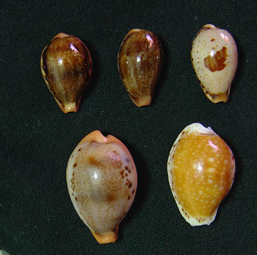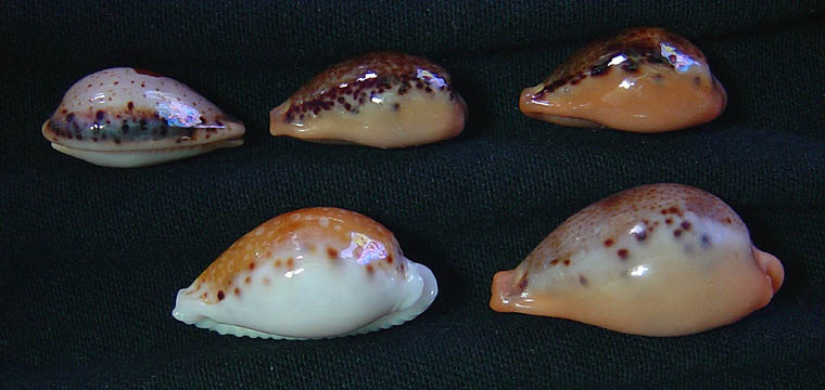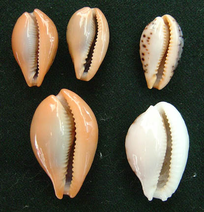 是蛋黃寶螺!下方左邊的玉女寶螺不確定是亞種,另外的2顆玉女是深海種,瑪瑙.白星.初雪不是深水種.
