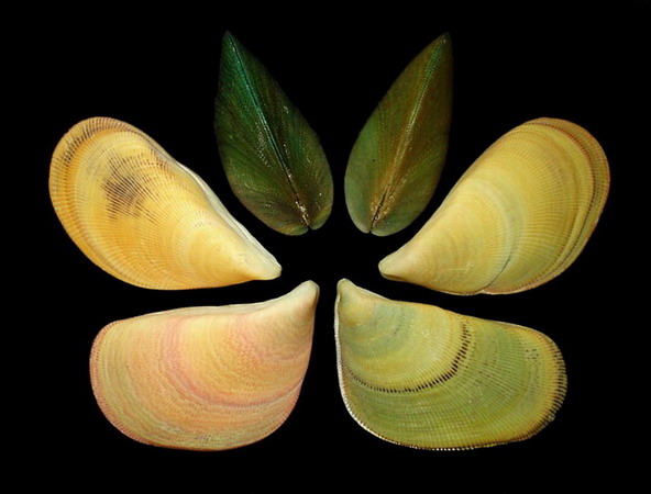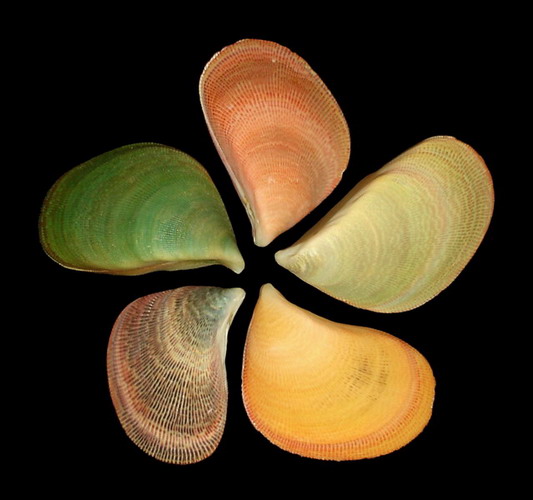 這些孔雀殼菜蛤,是十幾年前在澎湖五德海邊的廢棄貝殼堆裡找出來的,都是空殼,因為太多了,才能挑出一些較漂亮的。近幾年因垃圾車普及到鄉間,居民都把不要的空殼丟進垃圾車,就很難再有這個機會了。此蛤產量很多,棲在淺海岩礁底,食用貝類。
