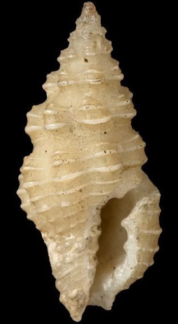 小型,橢圓塔狀,7個螺層,由一條深縫合線隔開,最後一螺層佔整體的一半大小;肋狀結構緊密,肋條上具胎面狀橫紋;胭脂蟲紅色;孔口狹長;邊緣有溝,呈球狀;切口觸及縫合線;紡錘形;管道極短;寬3.2mm;長7.4mm