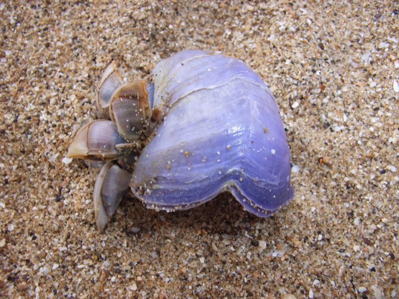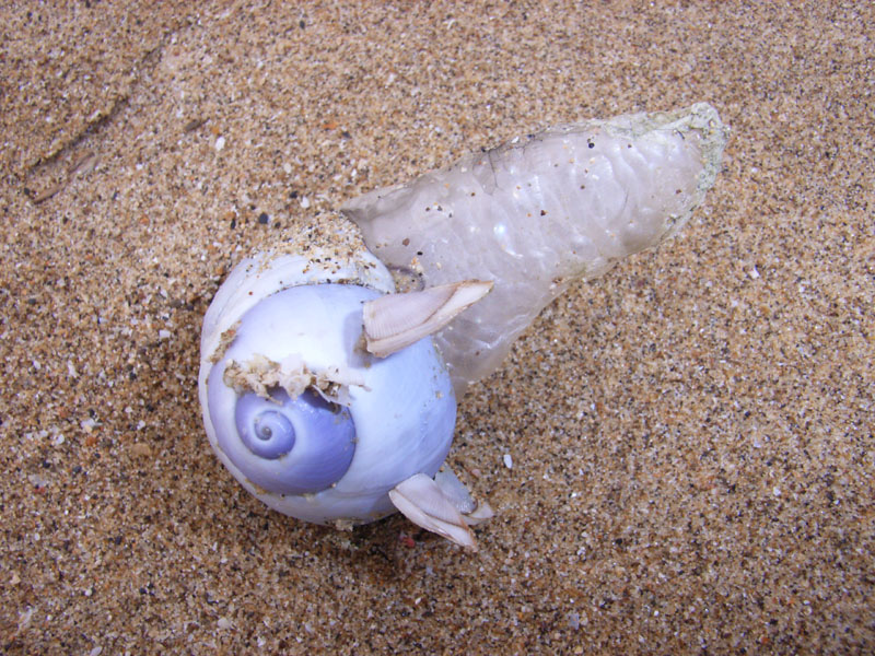之前都聽貝友說紫螺趁風追逐僧帽水母〈Physalia sp.〉而上岸,但岸上常可撿到一種透明長橢圓形且有垂直半圓帆,似乎不是 Physalia sp.的身上物,查了几本書才知紫螺也吃食帆水母 Velella sp.一類的水母,既是上圖站長所攝,也是透明帆的正主兒。