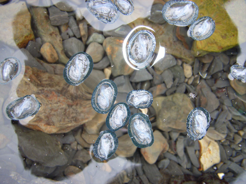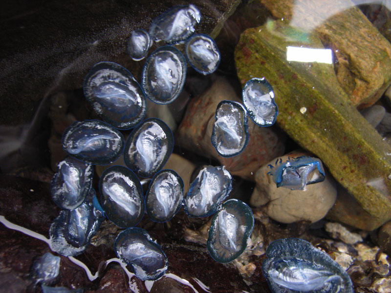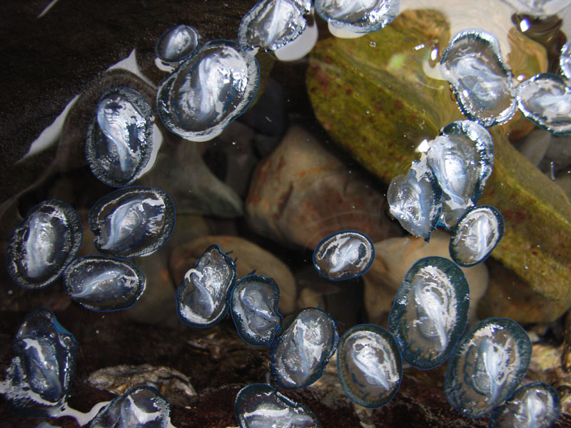 帆水母 Velella velella (L. 1758) velella 拉丁文:小〈ella〉帆〈vel〉之意;英名:By-the-wind sailor。帆斜受風橫行水世界。高中到福隆海邊露營,水略涼稍往外游突然四肢一滑動就有好幾點刺痛感覺,又看不到什麼東西,趕上岸四肢一堆略刺痛的小紅點,如今想來莫非是此種水母在作怪!