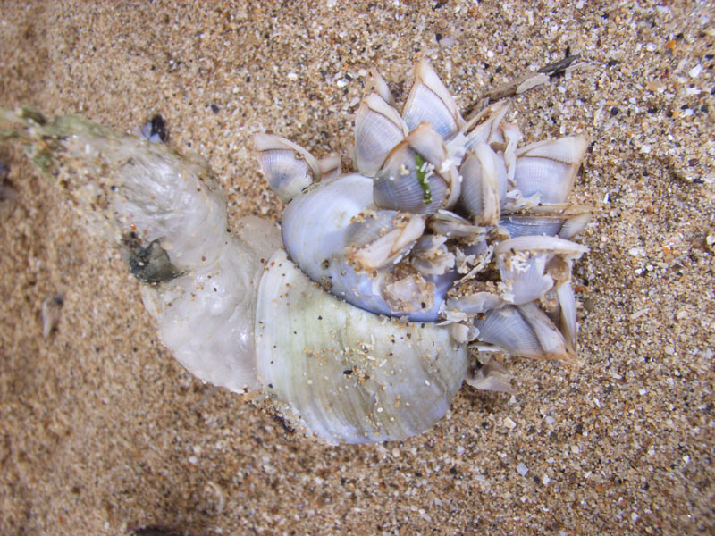 上星期四東北季風南下, 猜測紫螺應會被吹向陸地, 果然東北角紫螺大出, 都在2cm以上, 與半個月前的1cm以下相比有很大的差異, 3cm的紫螺甚至還長出茗荷介(滕壼的一種), 當然, 水母也很多, 潮間帶的水池及沙灘上到處都是被東北季風吹上來的水母